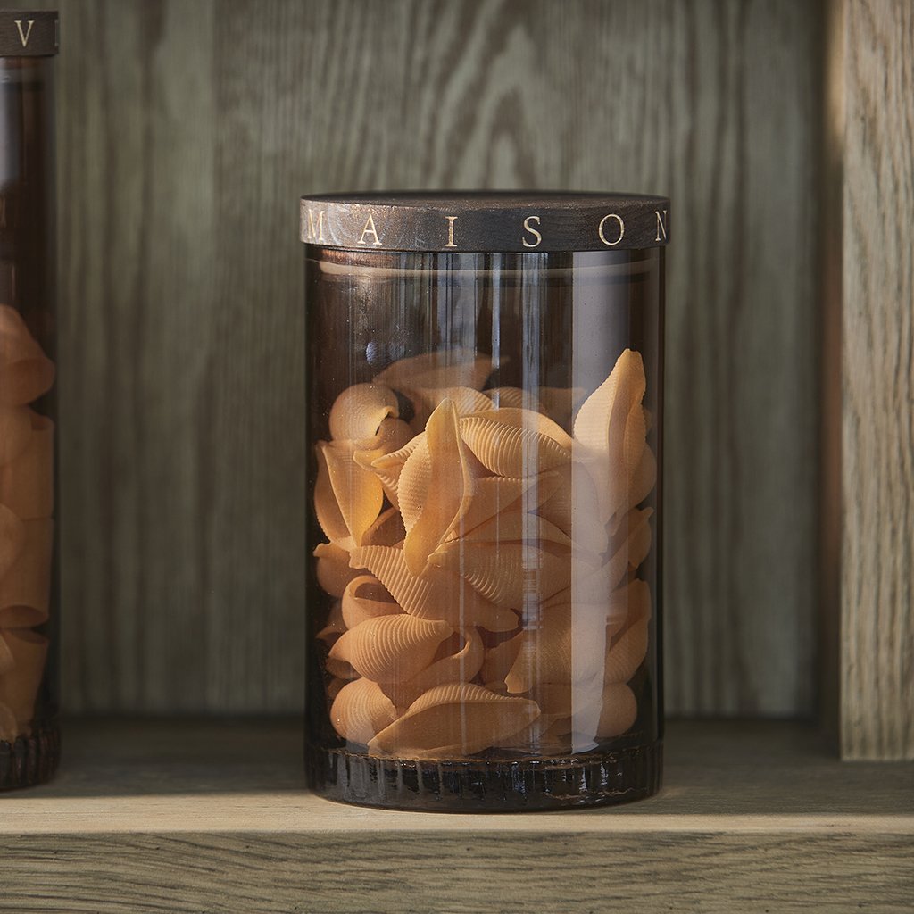 Úložná nádoba Sardis dopĺňa rovnomennú misu na ovocie a vytvára vo vašej kuchyni harmonický celok. Táto nádoba je vyrobená z tmavohnedého priehľadného skla a má drevené veko s vygravírovaným logom Riviera Maison a ponúka štýlové a praktické riešenie na uskladnenie. Je ideálna na uskladnenie prísad alebo iných kuchynských potrieb.Dodatočné parametre