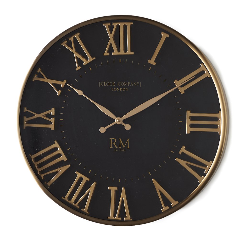 Štýlové hodiny s rímskymi číslicami a ozdobnými ručičkami, ktoré dodajú vášmu interiéru nádych elegancie. Majú čierny ciferník s mosadznými detailmi. "Clock company London" a "RM Est. 1948" je napísané na čiernom ciferníku. Hodiny majú hrúbku 5 cm, čo im dodáva robustný vzhľad.