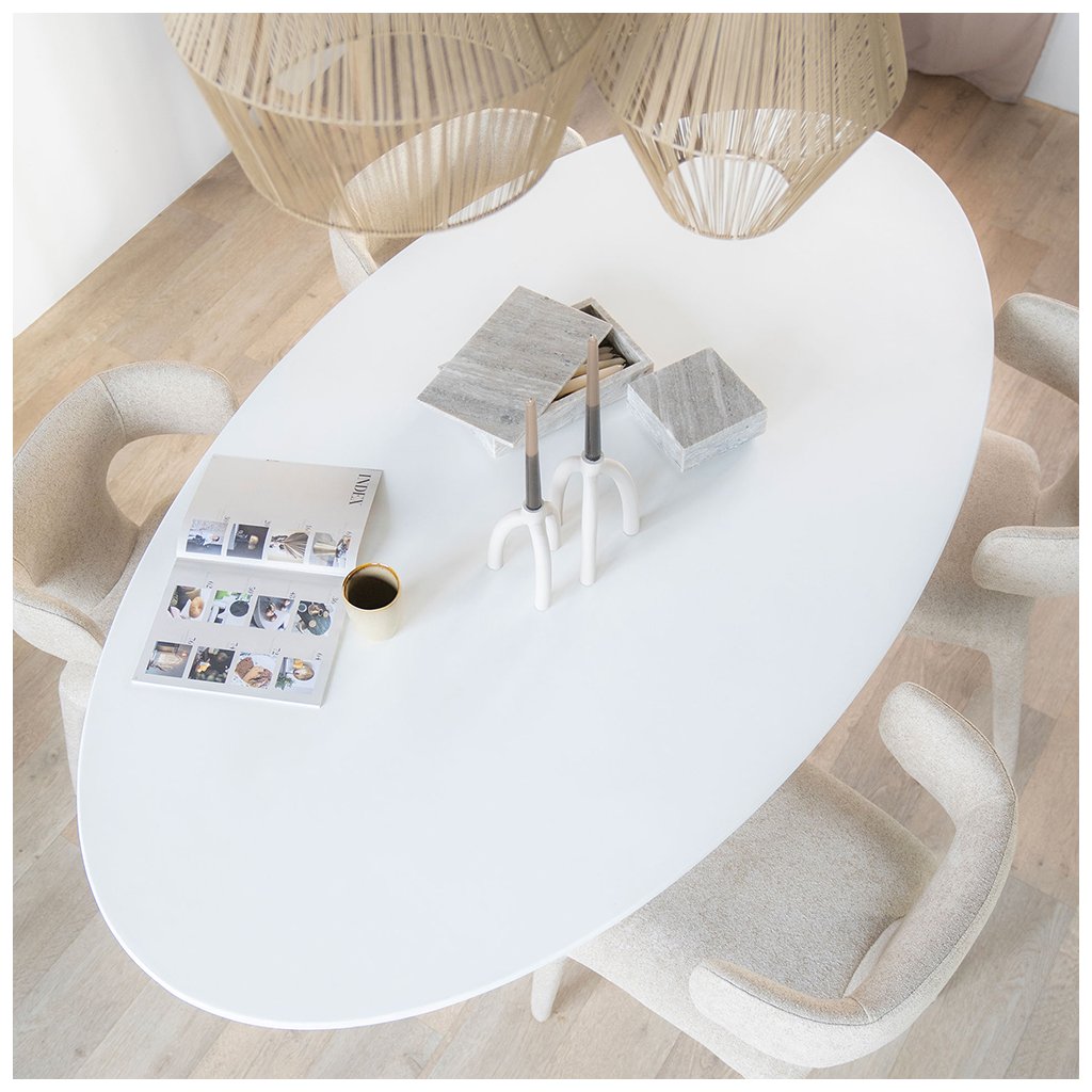 Elin je moderný jedálenský stôl s elegantným oválnym tvarom, ktorý pôsobí ľahko a zároveň výrazne. Mäkké línie dosky prirodzene podporujú komunikáciu pri stole a vytvárajú príjemnú atmosféru pri každodennom stolovaní aj väčších stretnutiach.