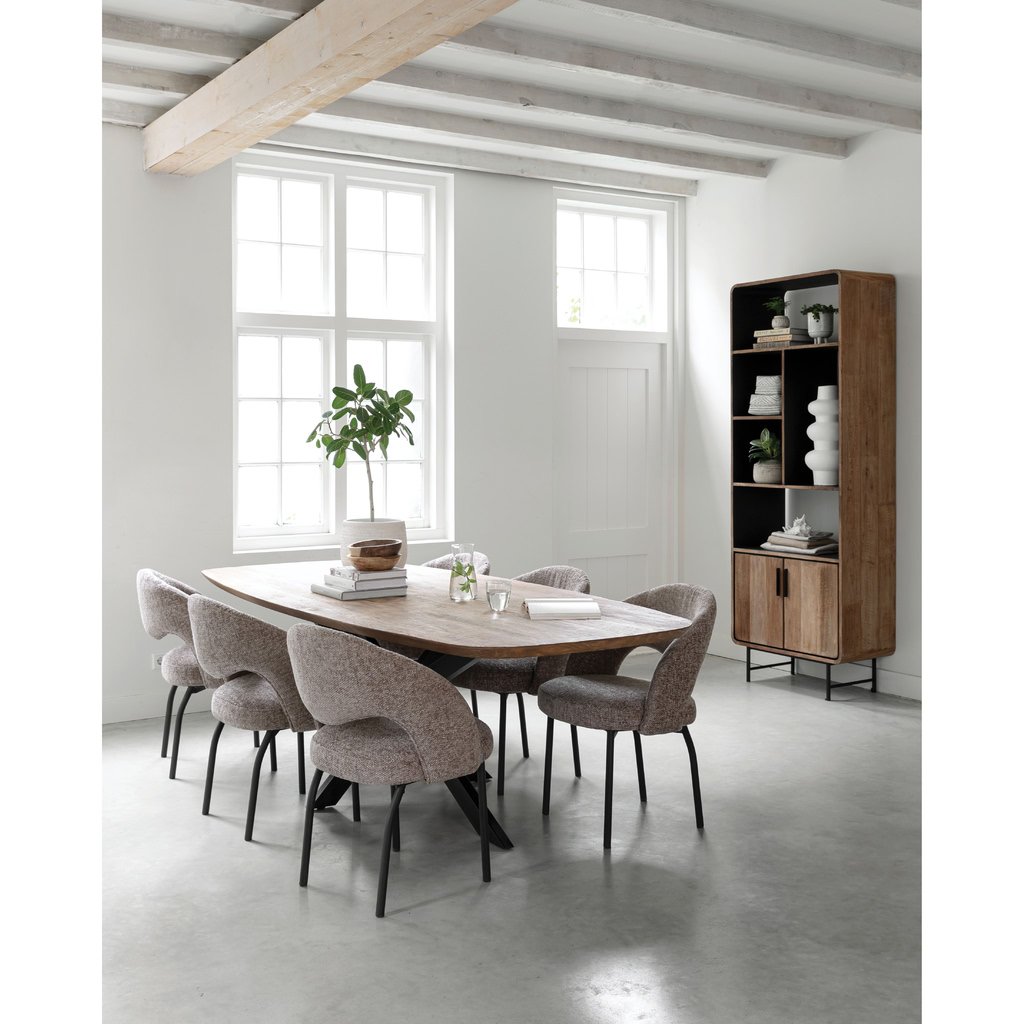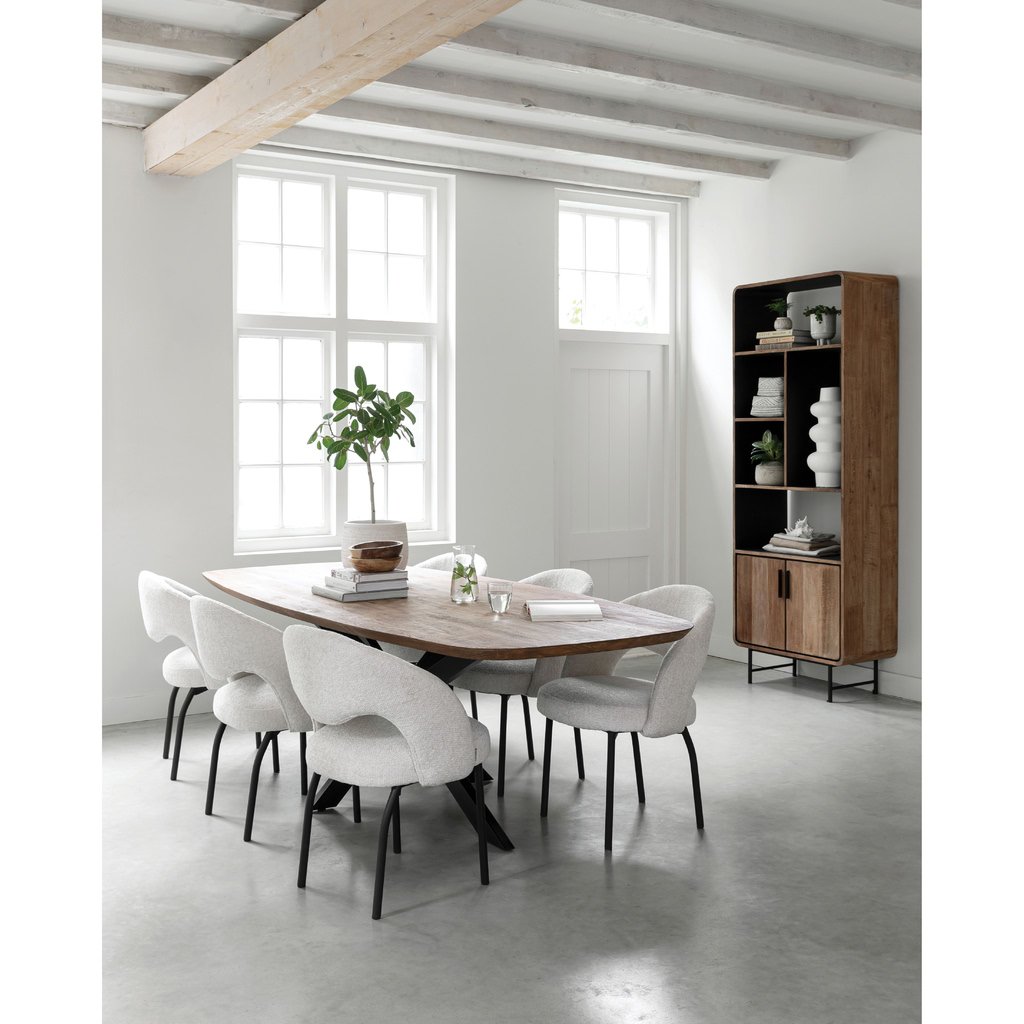 Jedálenský stôl z našej novej kolekcie Evo. Krásna kombinácia recyklovaného teakového dreva s kovovými a čiernymi prvkami. Preskúmajte celú kolekciu Evo so zaoblenými rohmi, masívnym recyklovaným teakovým drevom, kovovými prvkami a čiernym interiérom.