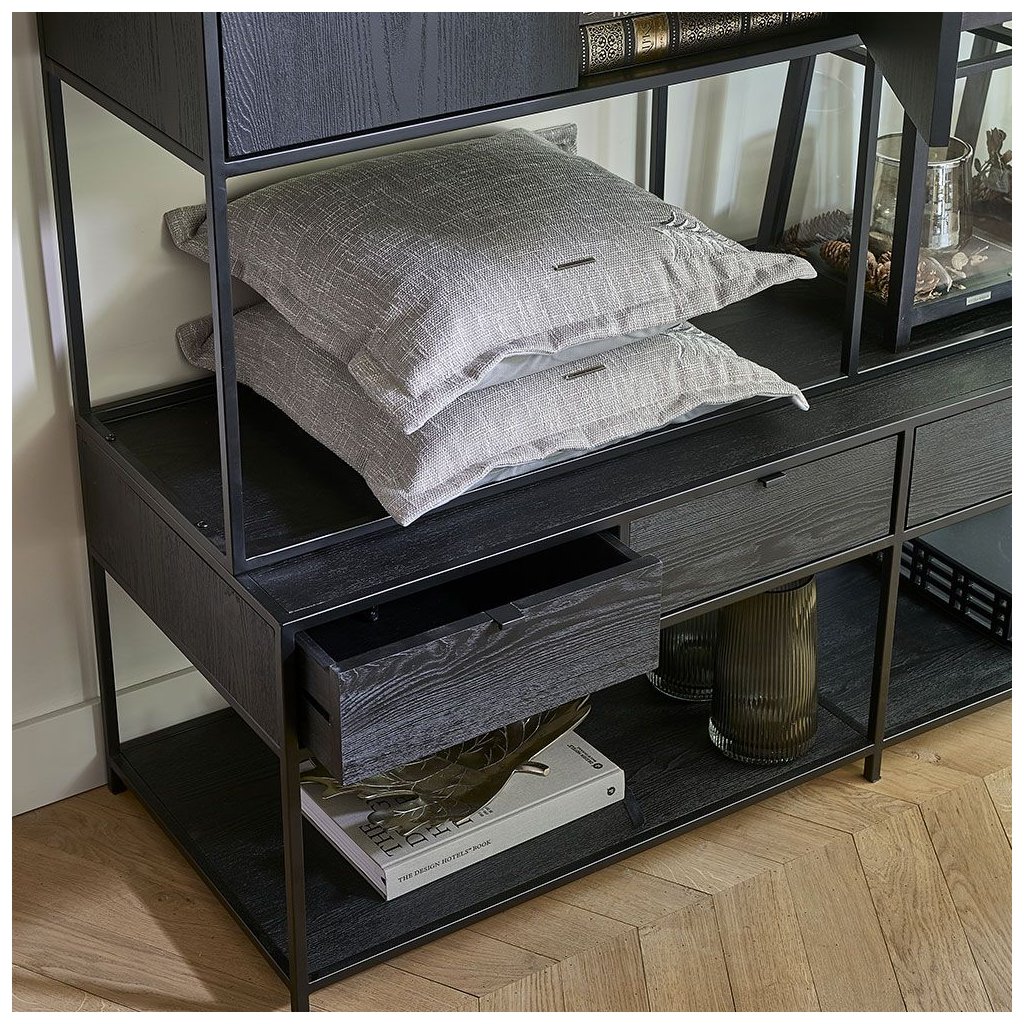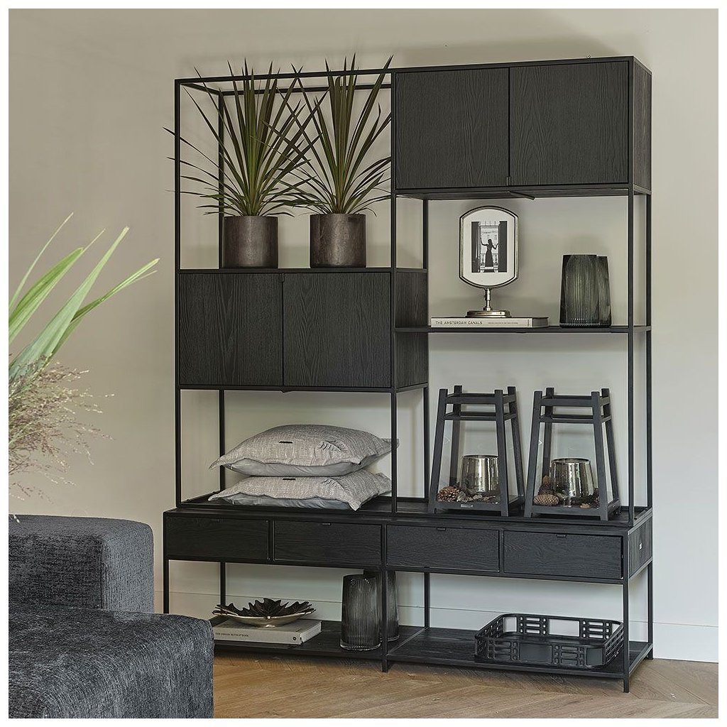 Otvorená knižnica Bobby je moderná s nádychom retro. Kombinácia elegantného tmavého kovového rámu a tmavého moreného dubového dreva vytvára moderný, robustný a ležérny vzhľad. Táto samostatná knižnica sa dá pripevniť k stene a má viacero zásuviek, otvorených priehradiek a dvierka s tichým zatváraním.Dodatočné parametre