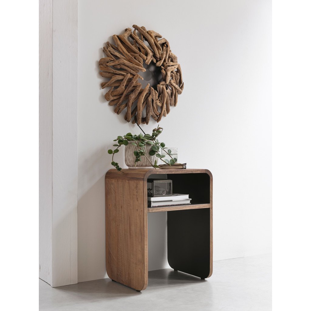 Nočný stolík z našej novej kolekcie Evo. Krásna kombinácia recyklovaného teakového dreva s kovovými a čiernymi prvkami.