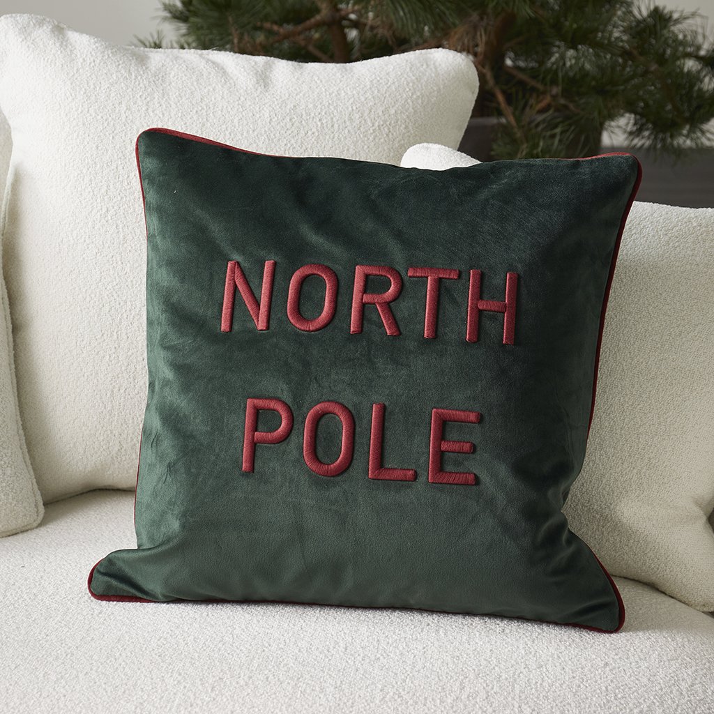 Vneste do svojho domova kúzlo sviatkov s týmto zamatovým zeleným poťahom na vankúš. Na poťahu je červenými písmenami vytlačený text „North Pole“ a má zodpovedajúci červený okraj. Tento elegantný vankúš vyžaruje ducha sviatkov a zimy.