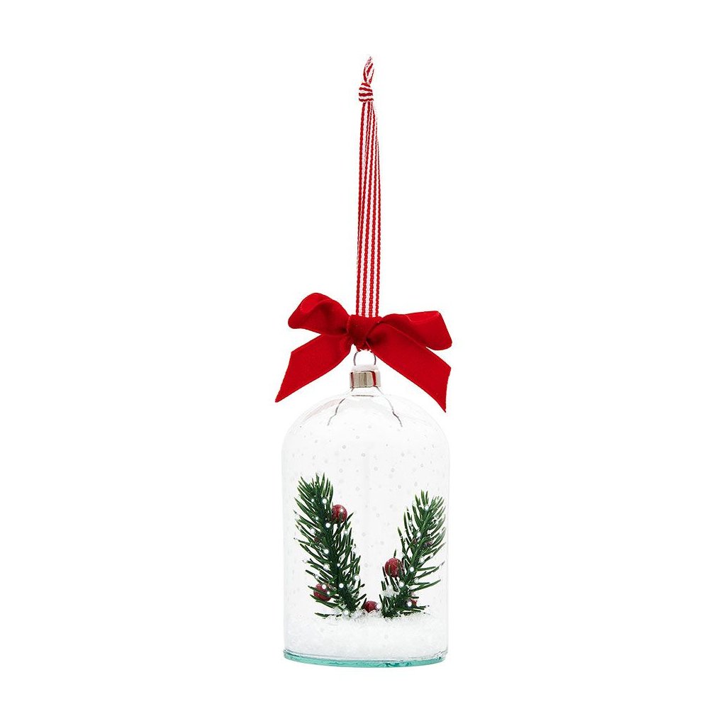 Ozdoba Winter Memories Ornament pozostáva z malej sklenenej zvonovej nádoby s tradičným vianočným tablom pod ňou. Pod sklom sú borovicové konáre, červené bobule a sneh. Sklenená ozdoba má červenú mašľu a visí na šikovnej červeno-bielej pásikavej stuhe.Dodatočné parametre