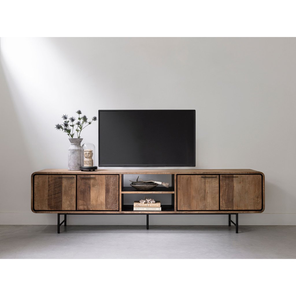 TV Komoda z našej novej kolekcie Evo. Krásna kombinácia recyklovaného teakového dreva s kovovými a čiernymi prvkami. Preskúmajte celú kolekciu Evo so zaoblenými rohmi, masívnym recyklovaným teakovým drevom, kovovými prvkami a čiernym interiérom.