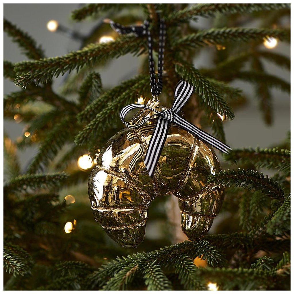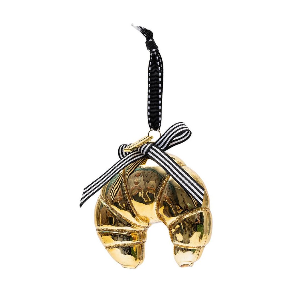 Ornament Le Croissant je pre každého, kto miluje francúzsky croissant a kto nie? Táto chrumkavá rolka je dodávaná v zlatom skle s lesklými detailmi. Pruhovaná mašľa v čiernobielom prevedení dotvára francúzsku atmosféru.