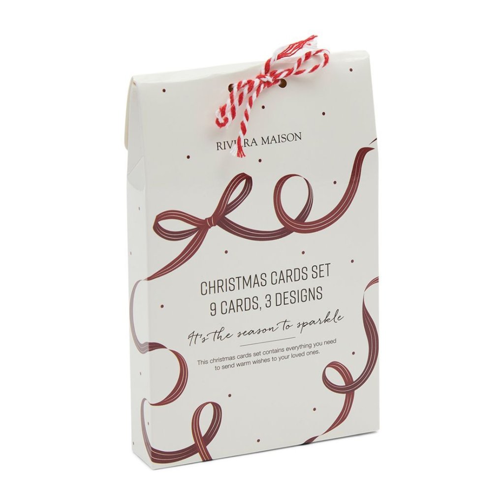 Biele vianočné pohľadnice majú červené detaily a sú ozdobené textami "It's the season to sparkle", "It's the most wonderful time of the year" a "Merry Christmas and a happy new year".