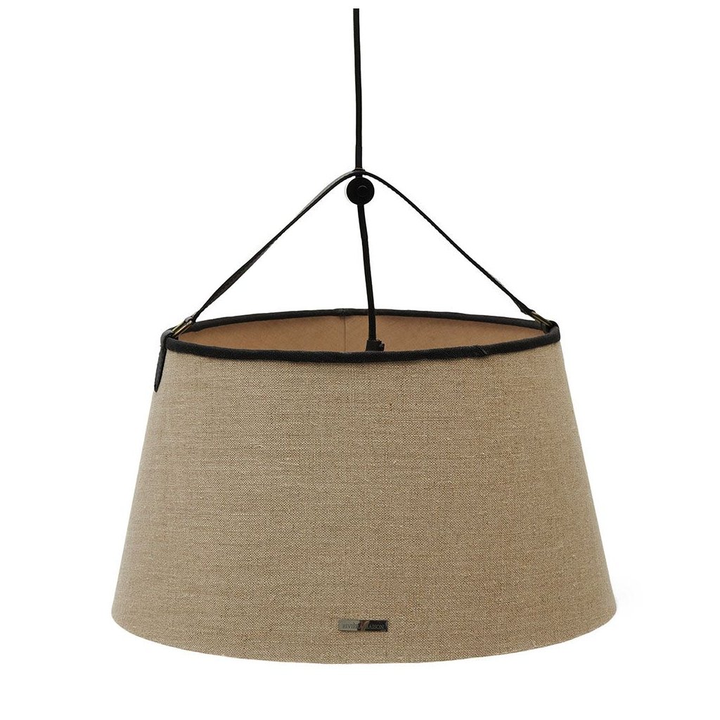 Materiály zvolené pre závesnú lampu Harbour Buckle M sú prírodný ľan a pevná tmavá koža. Tienidlo má rozšírený model a je podšité tkaným ľanom. Tienidlo visí na tmavom koženom opasku s prackou, ktorá mu dodáva tvrdý vzhľad. Samotná lampa visí na tmavej železnej šnúre zo stropu v tienidle.Dodatočné parametre